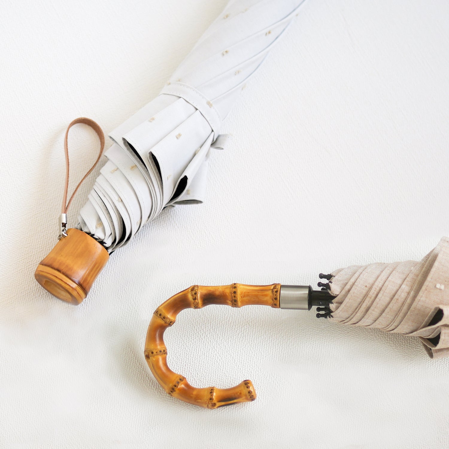 こちらの商品はコンパクトな寸胴タイプか、長傘のように持ち歩ける曲がりタイプのどちらかをお選びいただけます。(まがりタイプは+¥2,200)
