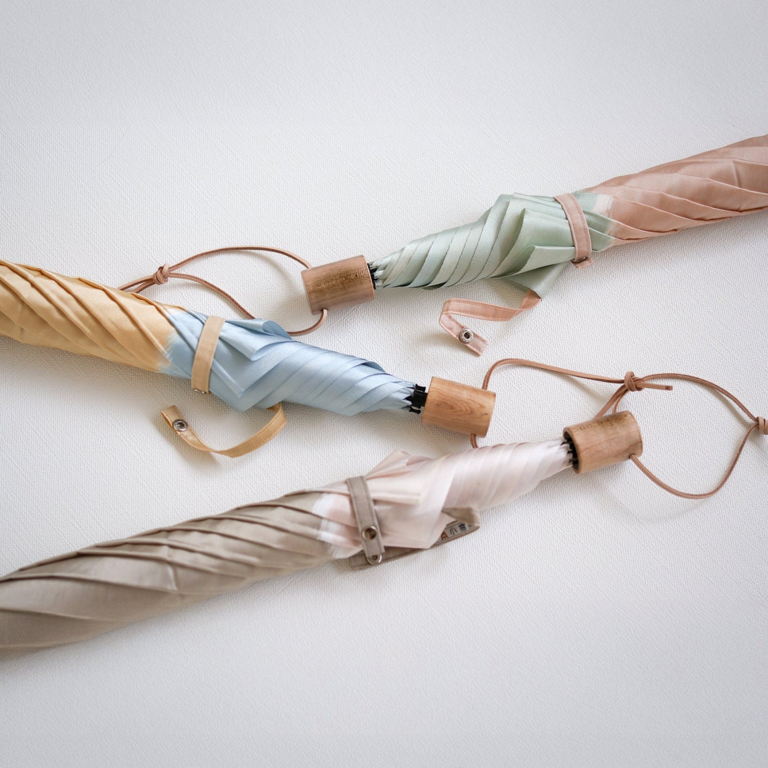 実際の染模様のデザインで捺染型を製作し、仮織をした経糸に捺染を行ない、最後はそれを「ほぐし織」の技術で織模様で表現した甲州織の雨晴兼用傘です。仮織した糸を抜き取りながら織り上げていくことで、境界線がゆらぎ、2色が溶け込むような傘生地が出来上がりました。植物や果実などの自然がもつそれぞれの色を取り入れたカラーバリエーションのため、主張しすぎない明るさと色どりで、ライフスタイルや現代のファッションに合わせやすい傘になりました。