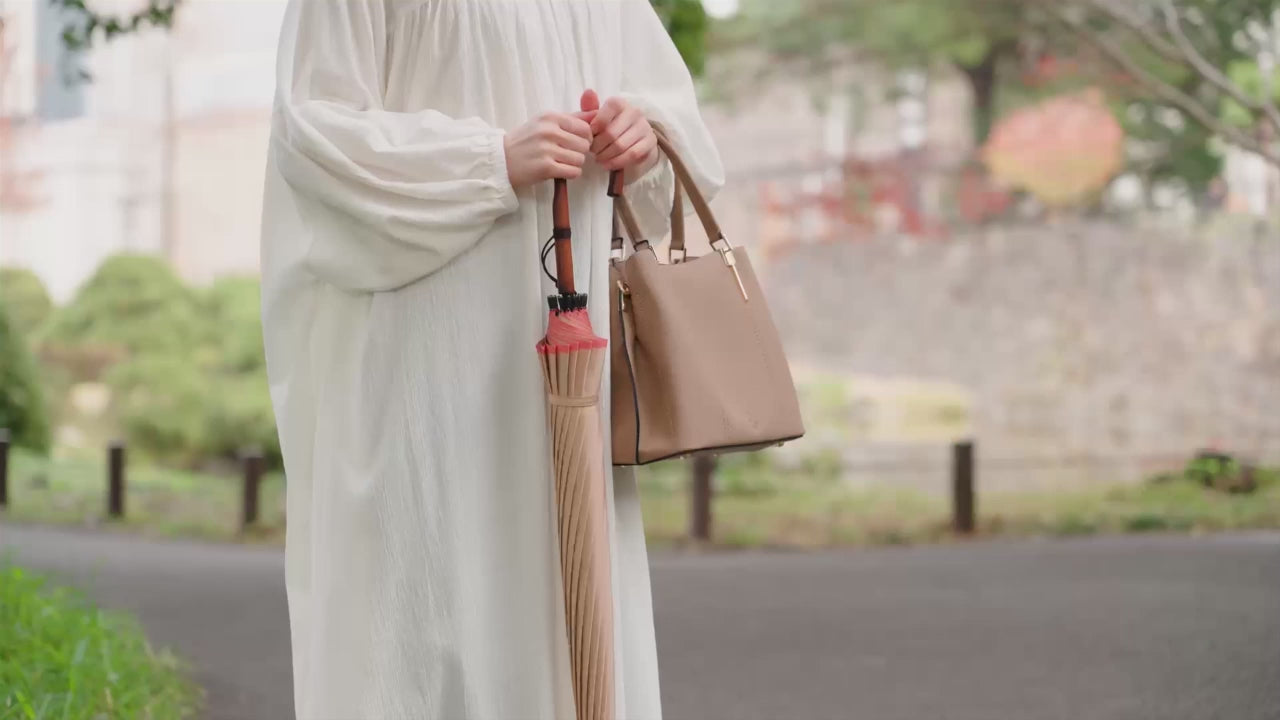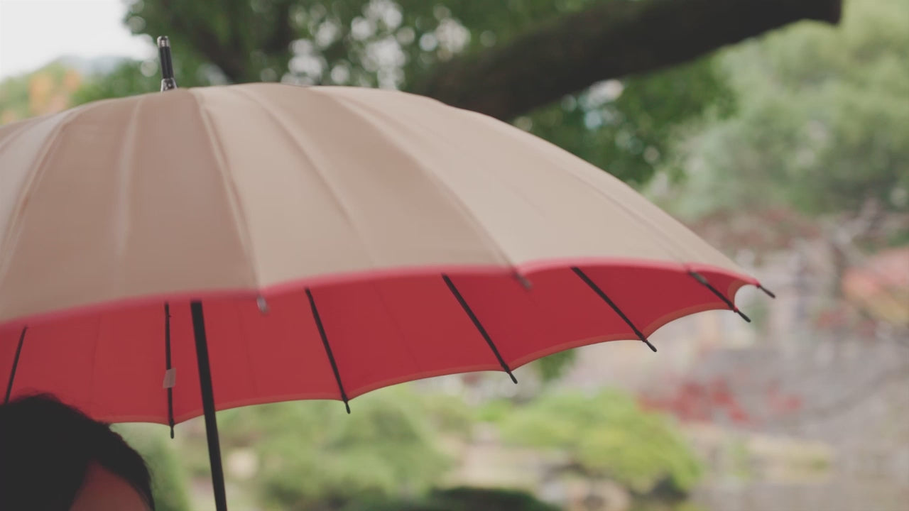 長傘でしか表現できない16本の骨の美しさを最大限に引き出した傘です。球体に近い優美な差し姿を印象付けるため、お着物でのお出かけにも最適です。軽量のカーボン骨を使用しているため、丈夫で軽い傘になりました。