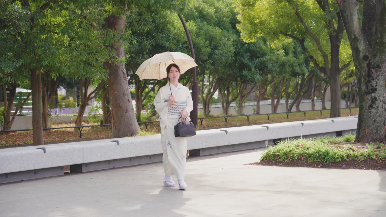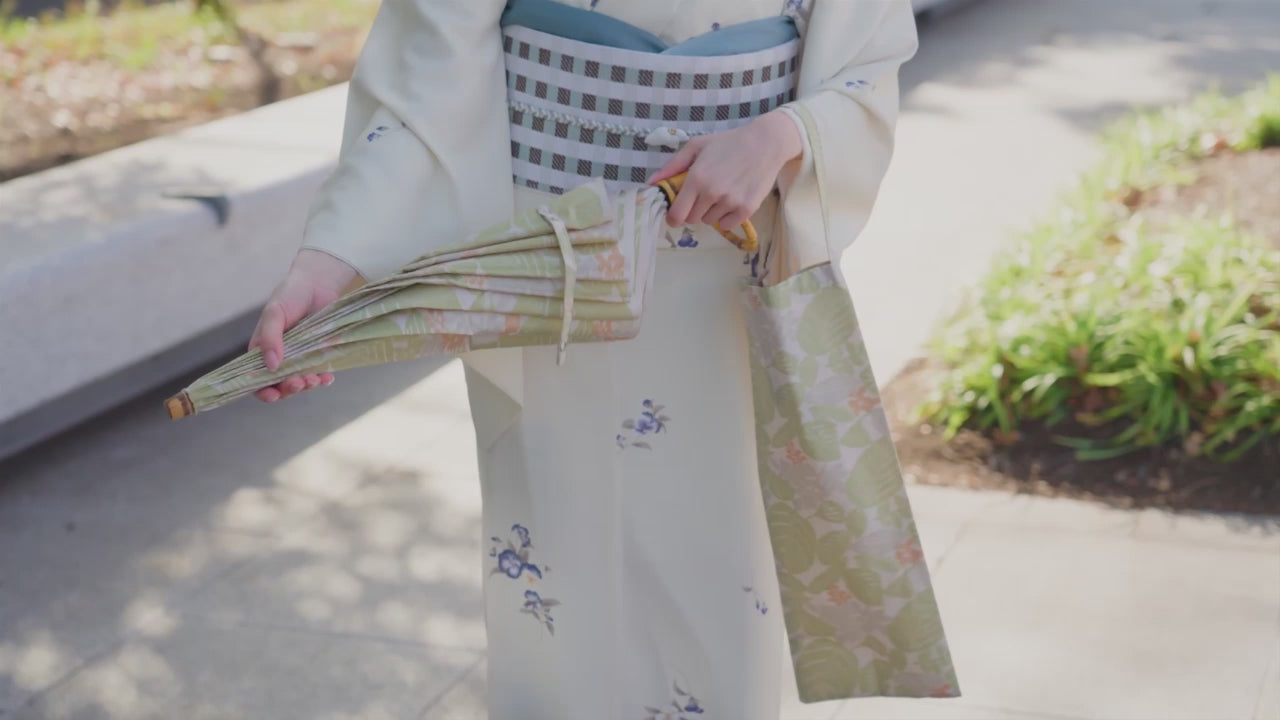 型染め、注染などによるオリジナルの染布を制作している松永武さんと高井知絵さんご夫婦によるユニット「kata kata」と小宮商店がコラボレーションした晴雨兼用傘です。ポリエステルとコットンを掛け合わせたほぐし織の生地の風合いが柔らかく優しい雰囲気を演出します。また袋がエコバッグになり、丸めて収納が出来るだけでなく、傘骨を伸ばした状態で持てる2WAY仕様のため、機能性も高い折りたたみ傘です。