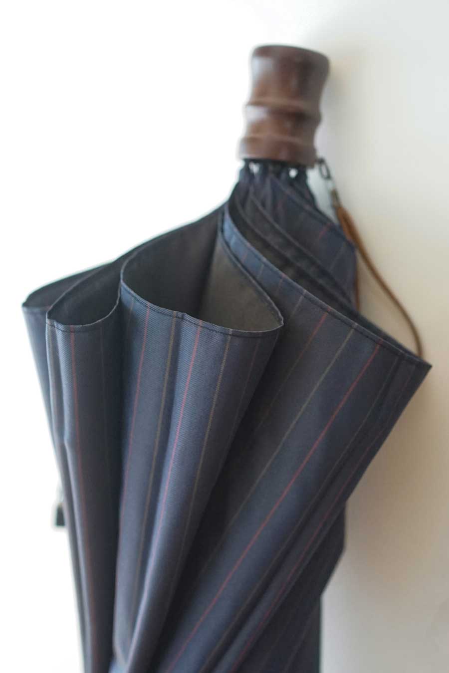 上品でシンプルなストライプ柄を山梨のドビー織で表現しました。 先染めならではの光沢感が魅力で、軽量な生地ながらも高級感を引き立てます。 スーツにも合わせやすい、ネイビーとグレーのカラーに2色のストライプが入った、おしゃれな折りたたみ傘です。