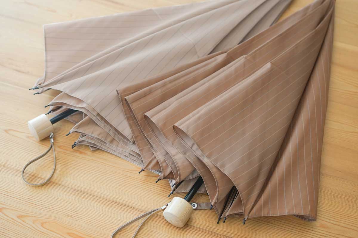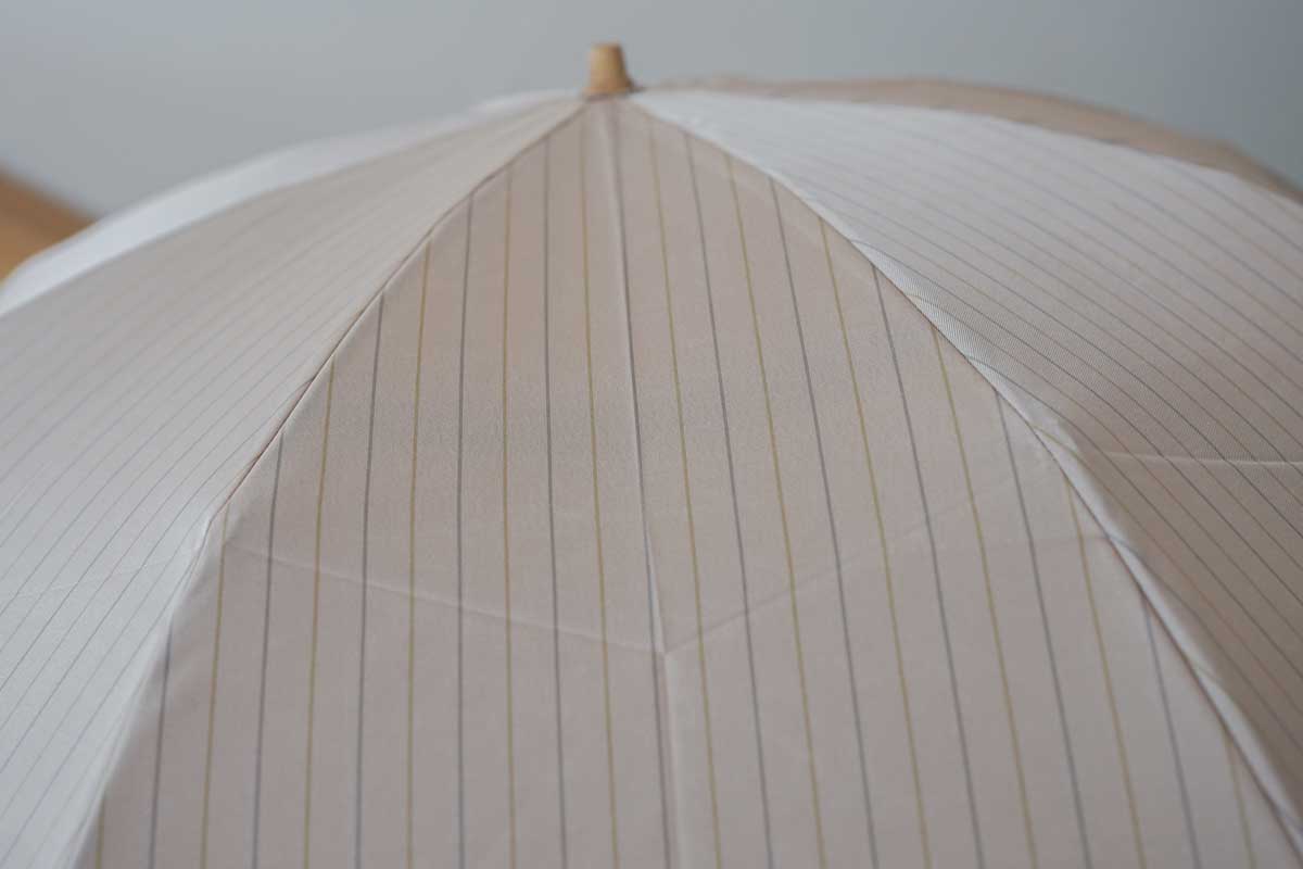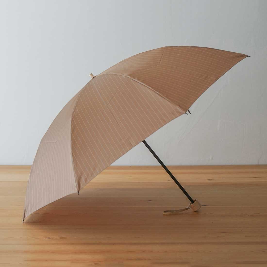 肌になじむベージュをベースにしたカラーの甲州織生地と、ユニセックスで使用できるサイズを組み合わせた雨晴兼用折りたたみ傘です。上品でシンプルなストライプ柄を山梨のドビー織で表現したため、先染めならではの光沢感が魅力で、軽量な生地ながらも高級感を引き立てます。